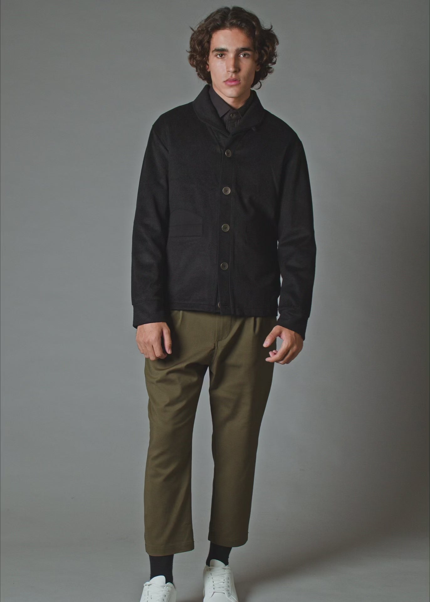 This black, durable wool cardigan can be worn as a light jacket or mid-layer. The beauty of this piece lies in its details, including reinforced pocket facings, signature brass buttons, a shawl collar, and elbow patches. The interior is finished like a tailored jacket with our signature yellow seam cover trim. It is crafted from 100% Scottish wool and promises unmatched durability and long-lasting wear. In true Descendant of Thieves fashion, it's unnecessarily well-made, destined to be rediscovered by your unborn grandchild in future vintage shops that don't yet exist.
