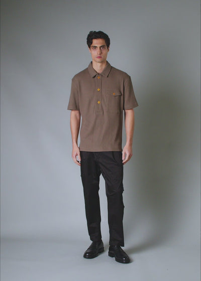 Achieve a vintage-inspired modern look with this relaxed-fit (RLX) Polo. Designed with a structured collar that buttons up to function as a wind guard and a three-button elongated placket. A flap chest pocket adds a utilitarian touch, while side hem snap buttons offer versatility. The polo shirt originated in the late 19th century as attire for polo players, featuring a button-up design for style and practicality. Later, it gained popularity in industries like construction and manufacturing for its rugged construction and comfort, making it ideal for labor demands. This particular polo was inspired by a vintage workwear polo used by mechanics in the automobile industry, sourced from our vintage vaults.