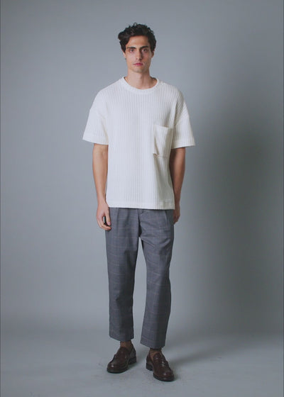 The open stitch tee brings quiet confidence. It's breathable, relaxed, and subtly revealing. It's knit with vertical ribbing for structure and finished with an off-center patch pocket that breaks the symmetry just enough. It’s minimal with edge.
