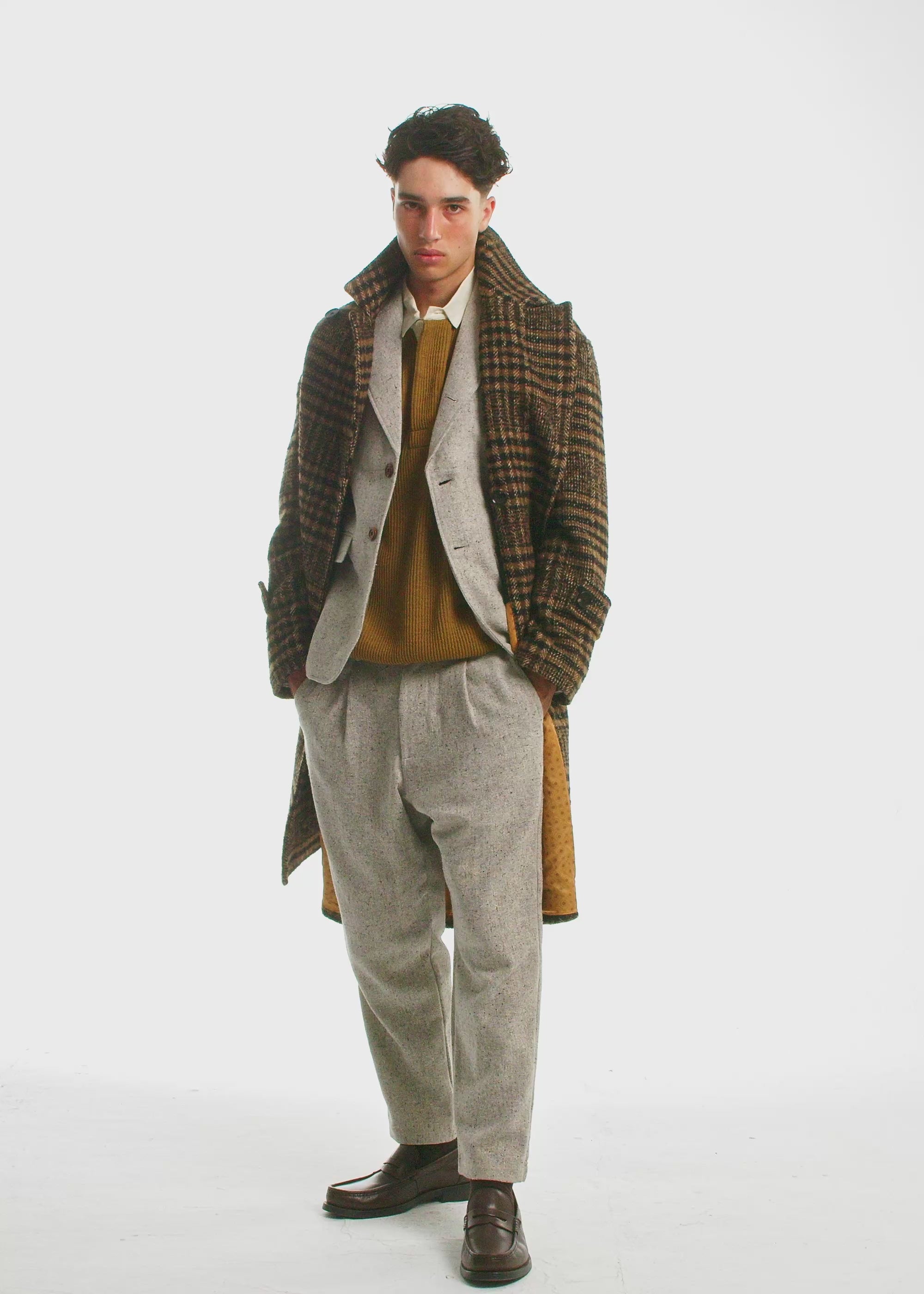 The Boxer Fit pant is a wide single-pleat Pant designed for those seeking a relaxed fit. Cut from a wool-blend tweed with a rugged yet refined hand. The surface tells its own story: flecks of darker yarns scattered across a muted grey base. A play on winter white. A quiet contrast to plain solids. Designed with functionality, discreet zip compartments are built into the front pockets, creating a pocket within a pocket to secure your valuables. Nothing slips out, and no one slips it out for you. Ideal for those on the move, and clever enough to keep your device scratch-free. Made in small batches, unnecessarily well, and destined to be collected by only a select few.
