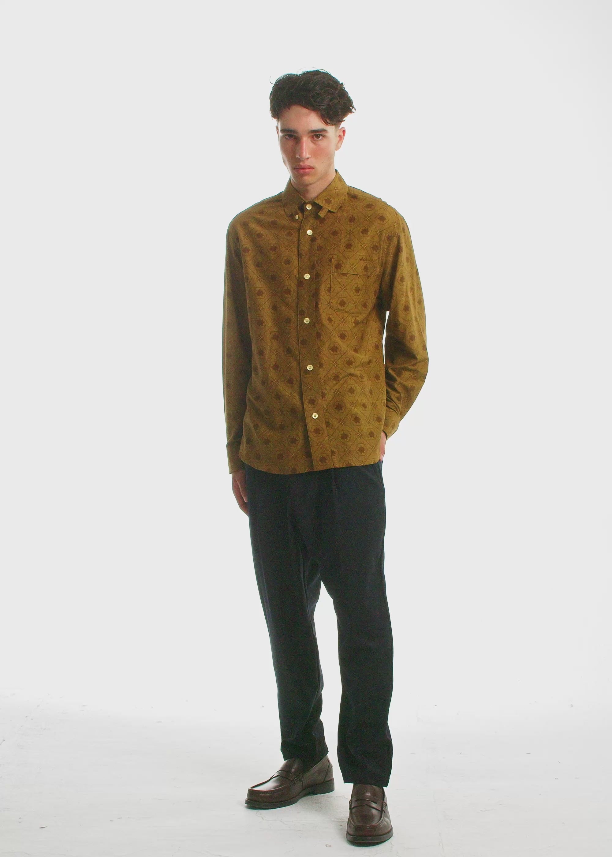 This item carries our signature DOT motif. A dot locked in a grid. Every yellow label bears this mark, hidden in plain sight, running through all we make. The mystery behind it: D.O.T. stands for Descendant of Thieves. Go down the rabbit hole, and the dot reveals the shape of a family tree… descending from a lineage of thieves. Our cotton silk blend carries the prestige of silk's luster and softness while offering a structured form that minimizes drape. A striking balance between easy-to-wear practicality and refinement.